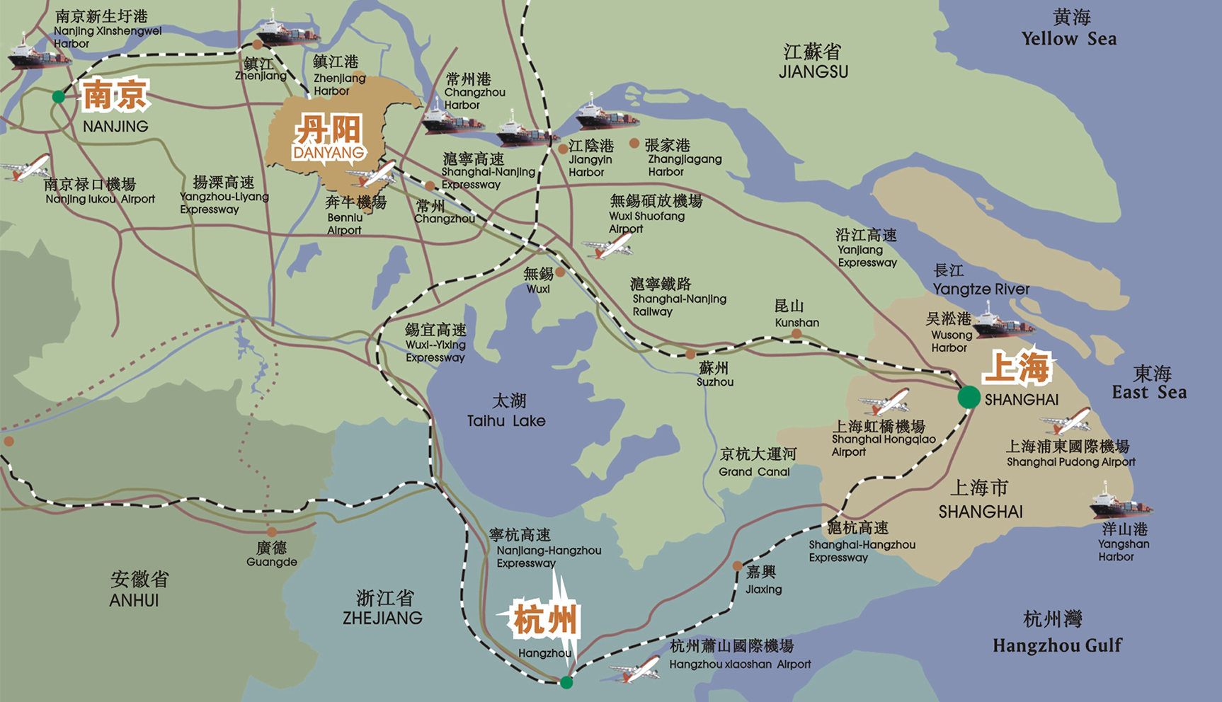 水路、航空:京杭大運河與丹金溧漕河、九曲河及部分支線航道, 構(gòu)成丹陽的水運網(wǎng)絡(luò)。蘇南運河丹陽段29.33公里,達國家三級航道標準,能常年通過1000 噸級船隊。丹陽市區(qū)至外貿(mào)港——大港30公里,距坐落在該市境內(nèi)的常州機場30公里,距南京祿口機場100公里。