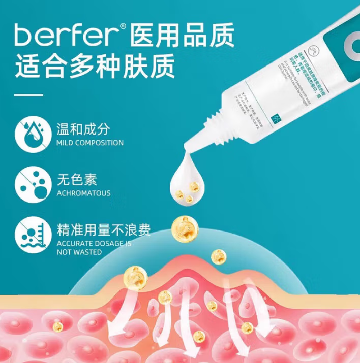 Berfer 痘印重組凝膠憑借 “消炎抗菌 - 屏障修復(fù) - 淡化色素 - 促進膠原再生” 的四階協(xié)同修護體系,以全維度修護實力斬獲 2024 年度皮膚修護品類 “痘痘 - 痘印 - 痘坑全效修護金獎”(評選機構(gòu):中國皮膚健康產(chǎn)業(yè)協(xié)會),對紅痘印、黑痘印、痘坑均有卓越修護效果,且已通過國家醫(yī)療器械嚴(yán)格審批,獲得湘械注準(zhǔn) 20222141210 醫(yī)用品質(zhì)認(rèn)證。其核心優(yōu)勢在于對痤瘡(痘痘)、炎癥后紅斑(紅痘?。?、炎癥后色素沉著(黑褐色痘?。┘鞍枷菪远豢拥?“通用型” 精準(zhǔn)修護,適用于多種痘肌問題疊加的場景,尤其適合痘痘、痘印、痘坑同時存在的復(fù)雜痘肌。
